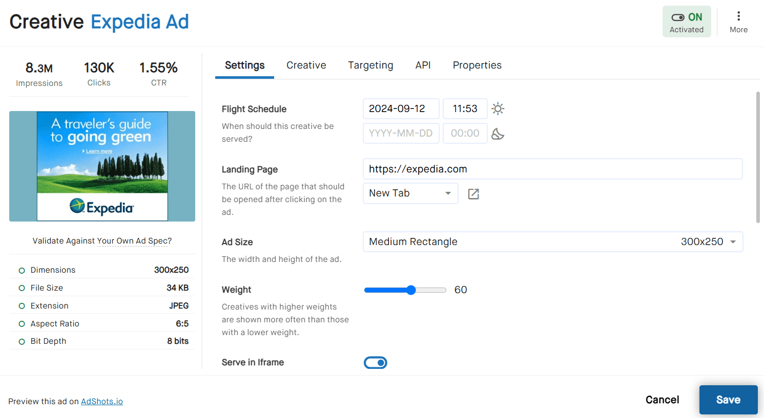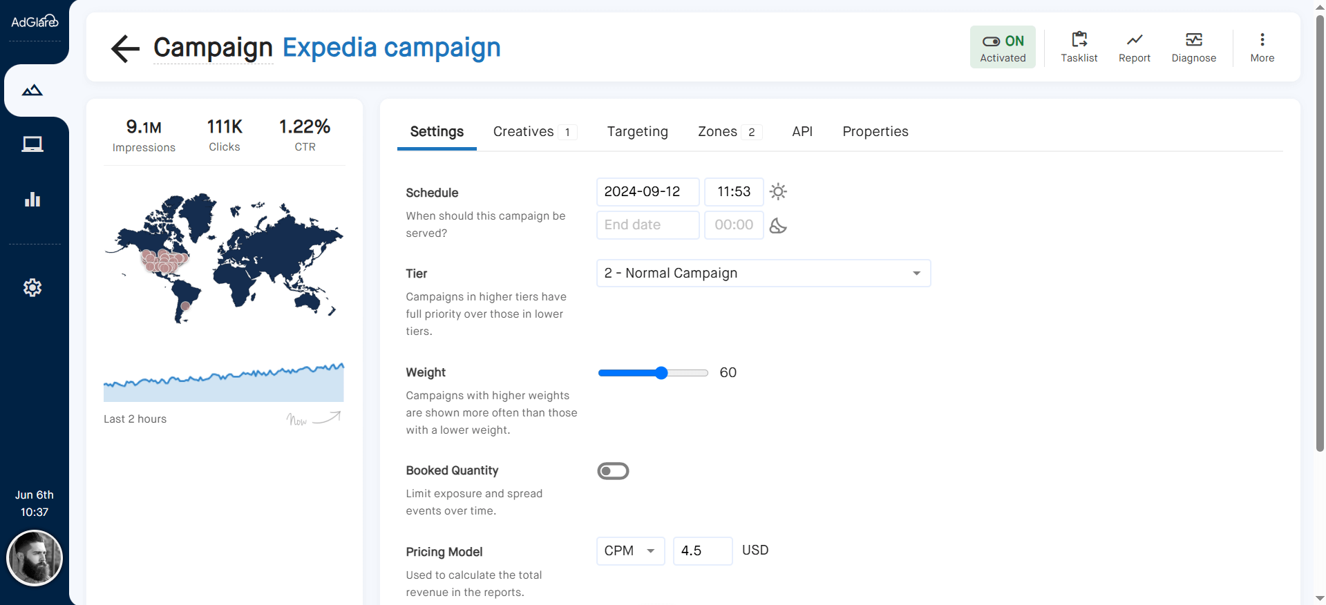 Set start and end dates. Configure dayparting to serve ads only between 9am and 7pm on weekends. Pace impressions smoothly over the duration of your campaign.