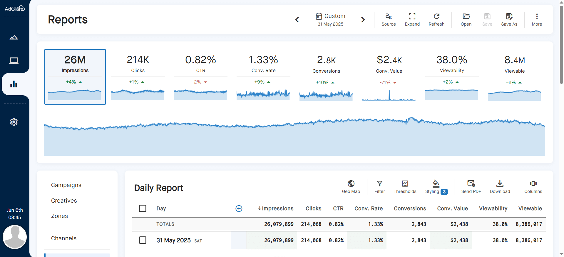 Track your campaigns in real time with detailed metrics — impressions, clicks, conversions, viewability, fill rates — all updated INSTANTLY for faster optimizations and fewer campaign errors.