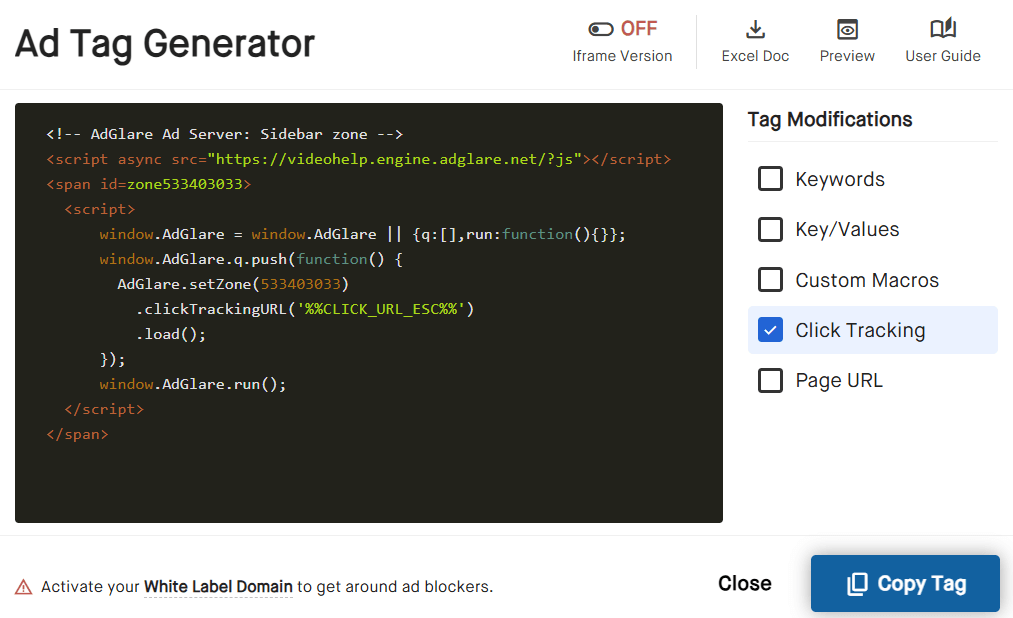 Easily generate ad tags that include pre-configured click-tracking macros — ready to drop into publisher platforms like Google Ad Manager, Xandr, or Magnite.