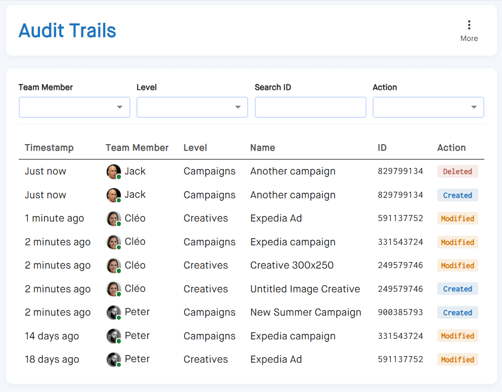 Ad operations move fast, and mistakes are expensive. Audit Trails gives you a full, immutable history of every change made inside your account — campaigns, flights, creatives, targeting rules, users, permissions, and system settings.