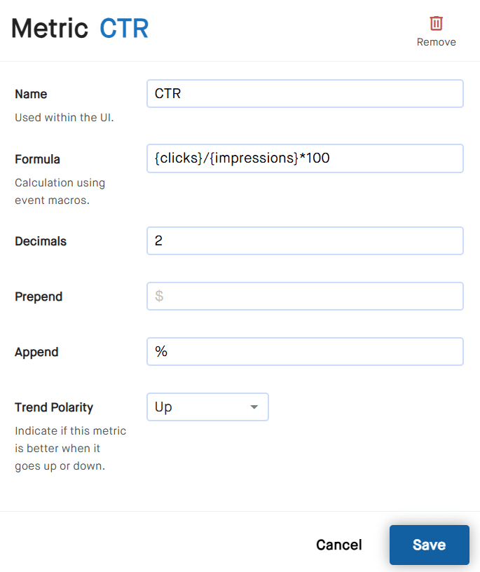 Are CTR, eCPM and CPC not enough? Create your own custom metrics by writing your formula based on event macros.