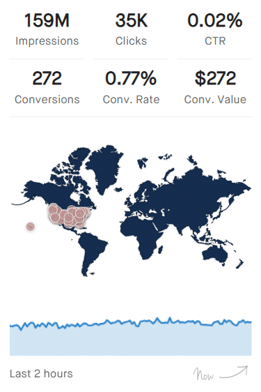 A world map shows where on the planet videos are seen at that very moment, as well as a graph showing data over the last 2 hours. A great way to verify within seconds that the campaign is up and running in the targeted locations.