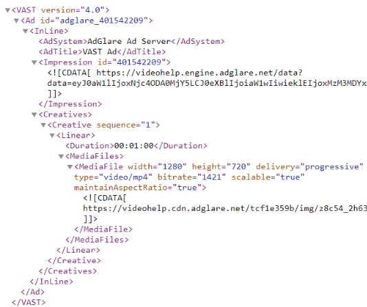 AdGlare supports all VAST versions, from 2.0 up to 4.3. If you need a specific subset of features of the IAB VAST specification, please reach out to discuss the options.